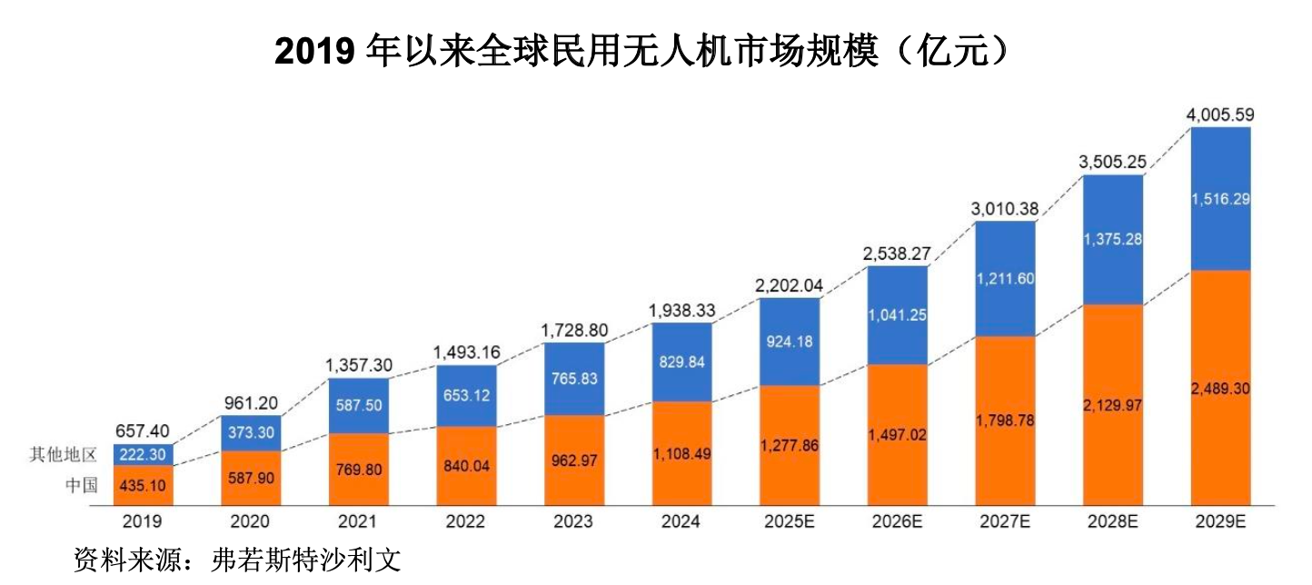 放眼全球,低空经济与智能机器人产业正以雷霆之势席卷全球,成为驱动未来经济增长的核心引擎。其中,无人机是低空经济与“新基建”的核心载体,近年来各国政府积极布局,根据弗若斯特沙利文数据,全球民用无人机市场规模从2019年的657.40亿元增长至2024年的1938.33亿元,复合增长率为24.14%。且随着物联网、新一代移动通信、储能等技术的不断革新与进步,民用无人机行业的应用场景更加丰富多元,预计到2029年市场规模将进一步达到4005.59亿元。
